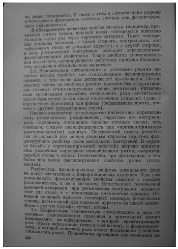 2.3. La señalización humana con series largas es muy cómoda para el uso de métodos fascinantes, en particular para la organización rítmica. Al parecer, uno de los métodos más antiguos fue la prolongación de las vocales (canto glissando, melopea). La organización rítmica de la serie de señales acústicas se conseguía por diferentes medios, entre ellos la repetición de las acentuaciones (incluso violando las aceptadas) o la repetición de los fonemas (prosa ritmada), o combinando uno con otro (versos ritmados).
