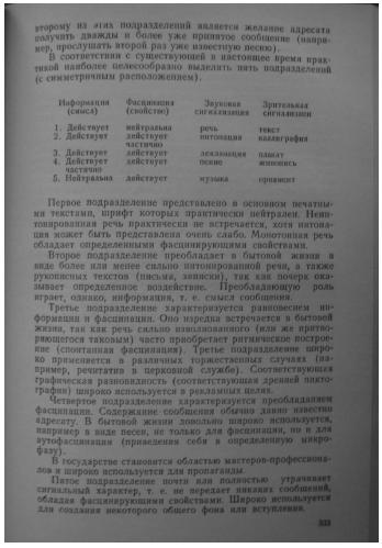 La señalización humana moderna en sus dos variedades principales (acústica y visual) se puede subdividir en neutra, donde el papel dominante lo juega la información (la razón de la comunicación), y fascinante, en la cual el papel principal lo juega la fascinación (las propiedades de la serie de señales). El criterio más simple para remontar hacia la segunda de estas subdivisiones es el deseo del destinatario de recibir dos o más veces la misma comunicación (por ejemplo, volver a escuchar una canción ya conocida).