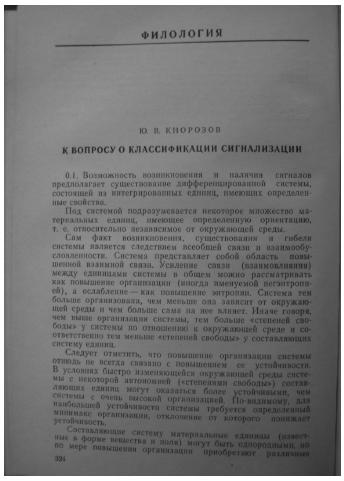 En el artículo, el autor, reconocido por haber descifrado la escritura jeroglífica maya a principios de la década de los 50's del siglo XX, examina los principios generales de los sistemas de señalización usados por los animales y los seres humanos. Sobre estos últimos, los más complejos, Knórozov detalla cuáles son los dos tipos de señalización humana y la manera como operan. En el primer tipo, neutro, predomina el contenido de la señal, mientras que en el segundo, fascinante, el papel principal lo juegan las propiedades. La señalización, en cualquier caso, funciona como medio para asegurar las relaciones funcionales entre los miembros del colectivo humano.