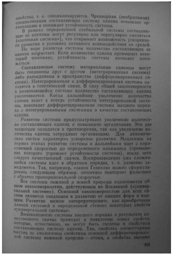 Todos los sistemas de la naturaleza animada e inanimada responden a leyes generales válidas en el Universo ("sistema universal"). La ley principal para todos los sistemas es la tendencia hacia el desarrollo desde las formas primitivas hasta las complejas. El desarrollo puede ser interpretado como la adquisición en cierta medida de algunas cualidades del "sistema universal" por parte de un sistema dado.