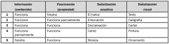 La quinta subdivisión pierde casi o totalmente su carácter de señal, es decir, estando dotada de propiedades fascinantes no transmite ninguna información. Se utiliza ampliamente para crear cierto ambiente general o preámbulo.