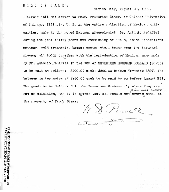 1 FSP, caja 1, f. 13, documento firmado por W. D. Powell, 20 de agosto de 1897. FSP hace referencia a Frederick Starr Papers, Archivos, Colección Especial ubicada en la Biblioteca Regenstein de la Universidad de Chicago.