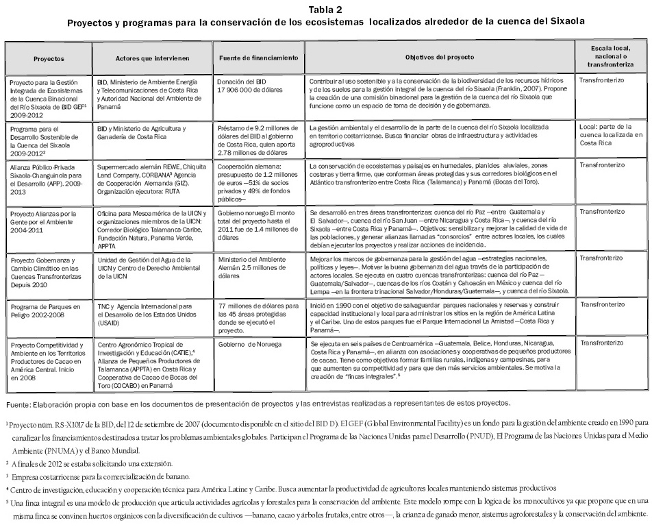 Organizaciones como la UICN, TNC, WWF, así como organismos intergubernamentales como el BID, han identificado esta cuenca como una región transfronteriza estratégica debido a su importante biodiversidad (Franklin, 2007). El BID considera que esta zona "representa una prioridad en conservación" debido a que en ella se encuentra una importante biodiversidad, así como importantes ecosistemas marinos, ya que sólo en la cuenca del río Sixaola se pueden encontrar seis áreas protegidas que cubren 143 000 hectáreas y representan el 40,3% de los espacios protegidos de Panamá y el 27,9% de Costa Rica (Matul, 2007: 107). Sólo en la parte alta de esta cuenca que corresponde al Parque Internacional La Amistad Caribe,11 se encuentran alrededor de un 4% de las especies terrestres mundiales (Franklin, 2007: 9).