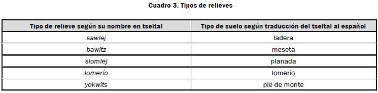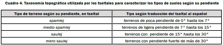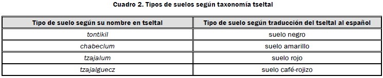 Al respecto, hay otro criterio muy sui generis que usan para distinguir los tipos de suelo, el cual está relacionado con el microclima del lugar. Así, un suelo puede ser también frío, sikil qu'inal, o caliente, kichin qu'inal, dependiendo de la altitud y de la cantidad de radiación que recibe del sol como consecuencia de la estación del año, lo que proporciona diferentes exposiciones solares por las sombras que se proyectan entre los cerros en las diferentes épocas. Lo anterior hace pensar que los tseltales reconocen y manejan un amplio registro de microclimas, producto de la topografía sumamente accidentada en la que habitan y de la interrelación con las vocaciones y aptitudes de cada tipo de suelo.