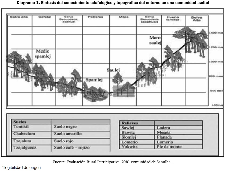 En el diagrama 1, transepto realizado por un equipo de trabajo durante una evaluación rural participativa en la comunidad de Sanulha', municipio de Sitalá, se recoge y sintetiza el corpus y la praxis del conocimiento previamente descrito del entorno comunitario y sus usos del suelo (ver diagrama 1).