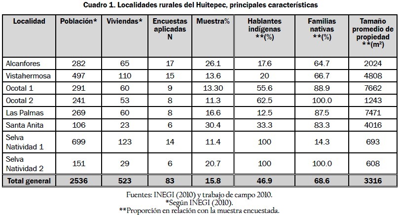 El trabajo de campo que sustenta esta investigación se realizó entre 2009 y 2010. Se realizaron 83 entrevistas estructuradas a pobladores de las localidades rurales del Huitepec, equivalentes al 15.8% del total de las viviendas y más del 10% de cada ranchería (cuadro 1). Los datos obtenidos incluyeron: a) información general de la unidad familiar integrantes, ocupaciones, origen, etnicidad; b) características de la propiedad y uso del suelo; c) fuentes de ingreso en la unidad familiar; d) en caso de haber producción agropecuaria, características de manejo, mercado y sus cambios en el tiempo. Además, se realizaron 17 entrevistas abiertas con informantes clave autoridades locales y pobladores antiguos y recientes para obtener información cualitativa de mayor profundidad sobre los cambios en la economía local, la agricultura y los actores sociales. También se realizaron recorridos de campo y observación participante en el Huitepec y algunos puntos de la ciudad.