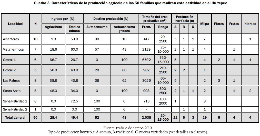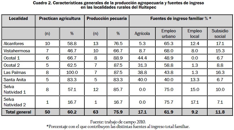Las localidades rurales del Huitepec presentan diferentes características en su conformación étnica, origen o propiedad de la tierra, algunas de las cuales se indican en el cuadro 1. Sin embargo, en general en estas localidades la agricultura continúa siendo una actividad importante, sobre todo en términos culturales y de autoconsumo, ya que se realiza en más de la mitad de los hogares entrevistados (60.2%), aunque en términos económicos contribuye sólo con un 17% al ingreso familiar, con diferencias importantes entre las localidades (ver cuadro 2). Su relevancia económica es mayor en las localidades de Ocotal 1 y 2, Santa Anita y Las Palmas, que tienen población predominantemente nativa, con presencia indígena, disponen de terrenos de mayor tamaño y están más alejadas de la ciudad, donde la agricultura aporta entre el 30% y el 44% al ingreso familiar (ver cuadros 1 y 2). Por otra parte, en las localidades Alcanfores y Vistahermosa, que tienen una mayor presencia de habitantes de origen urbano, son cercanas a la ciudad y poseen mayores servicios, la agricultura aporta menos del 10%. En las localidades Selva Natividad 1 y 2, recientemente asentadas en el área y que disponen de terrenos pequeños, la agricultura tiene un aporte económico nulo.
