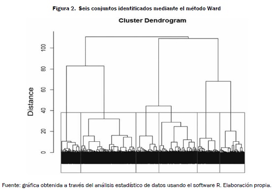 Tras calcular la distancia entre las observaciones, mediante el coeficiente Gower, era necesario usar un método que permitiera agruparlas, y una función que concentrara de manera jerárquica los valores obtenidos, en la cual los grupos se combinaran en categorías más grandes, pero al mismo tiempo se dividieran en subgrupos. La opción más viable fue usar el método Ward, el cual es un precursor de jerarquización que ayuda a optimizar algunos criterios para lograr la división de datos por agrupamientos jerárquicos (Johnson y Wichern, 2007: 693). Los resultados obtenidos a través del método Ward se visualizan empleando un dendrograma, donde los ejes verticales muestran el error de la suma de los cuadrados en el cual convergen (ver figura 2). Esto se calcula usando la función hclust del paquete "stats", del programa estadístico R: cumu <- hclust (mdist, method = "Ward"). Posteriormente el dendrograma se grafica usando este comando en R: plot (cumu, labels = FALSE, leaflab = c "none").
