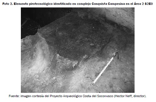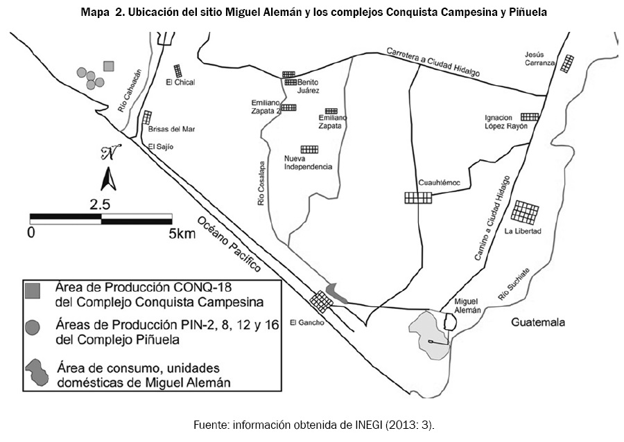 Es importante señalar que el término "complejo" no está relacionado a complejos cerámicos, sino más bien a grupos de montículos que se encuentran cercanos entre sí, además de delimitados geográficamente, ya que se sitúan en isletas distintas dentro de los esteros. Tanto en el complejo Conquista Campesina como en el llamado Piñuela se observaron múltiples ocupaciones prehispánicas desde el Preclásico Temprano hasta el Clásico Terminal. La información analizada en esta sección fue recopilada a través del Proyecto Arqueológico Costa del Soconusco (PACS). El sitio Conquista Campesina se ubica cerca del ejido que lleva el mismo nombre; y el complejo Piñuela, cerca de la Ranchería El Sajío (ver mapa 2), ambos en la región del Soconusco, Chiapas. Para el estudio de estos sitios arqueológicos, la primera parte del proyecto empleó LIDAR un acrónimo del inglés Light Detection and Ranging para identificar montículos de tierra, los cuales fueron posteriormente analizados in situ para determinar si fueron ocupados durante la época prehispánica. Posteriormente, se emplearon técnicas de prospección remota, en específico radar de penetración terrestre (GPR) y magnetómetro para identificar anomalías como consecuencia de actividades asociadas a la producción de cerámica, tales como la cocción.