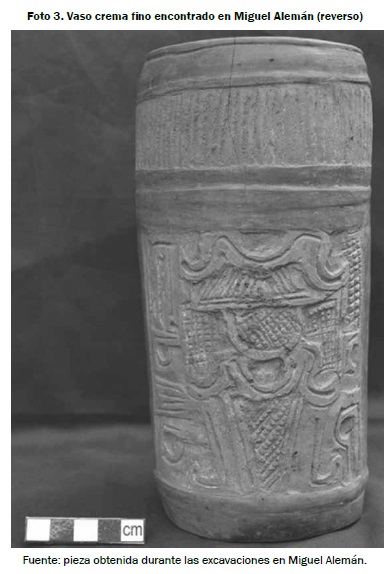 La ausencia de segregación en el consumo y la apenas perceptible variabilidad de los conjuntos cerámicos pueden estar asociadas con un control descentralizado sobre las fuentes y la tecnología cerámica (Pool y Bey III, 2007; Urban y Schortman, 2004). Por lo que respecta a las áreas de producción, se puede argumentar que en éstas se comerciaba lo producido con asentamientos vecinos. Esta red de intercambio a nivel local pudo también haber tenido un alcance regional y macro- regional, ya que se encontró una vasija completa del tipo crema fino, muy parecida a los tipos provenientes de Escuintla, en el Pacífico guatemalteco (Oswaldo Chinchilla, comunicación personal 2014) (ver foto 3).