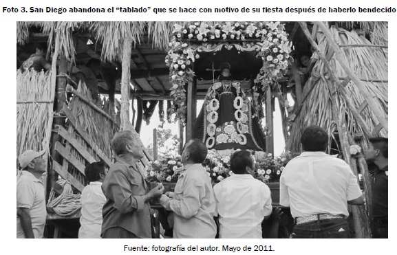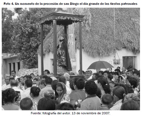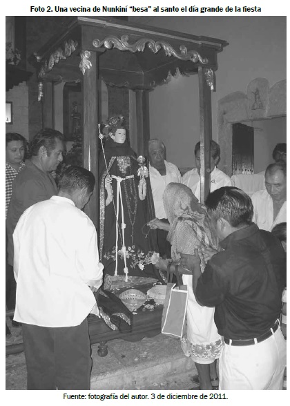 Una muestra de lo que vengo mencionando hasta aquí la hallamos en la creencia generalizada de la que hacen gala los habitantes de Nunkiní, en que la imagen de san Diego que se encuentra en la población no es una mera representación iconográfica de un personaje histórico del siglo XIV, sino que ante sus ojos resulta ser la personificación misma de una entidad sagrada.12 O lo que es lo mismo: la talla de madera que durante todo el año se resguarda en el nicho central de la iglesia de la comunidad atesora poderes sobrehumanos; y por ende, resulta milagrosa y sagrada en sí misma, de lo que ha dado sobradas pruebas a lo largo de la historia. Este carácter sagrado que atesora la imagen la ubica en un ámbito diferenciado del mundo ordinario y la reviste "de una carga o potencia de la que carecen otros aspectos de la realidad" (Bartolomé, 2006: 99).