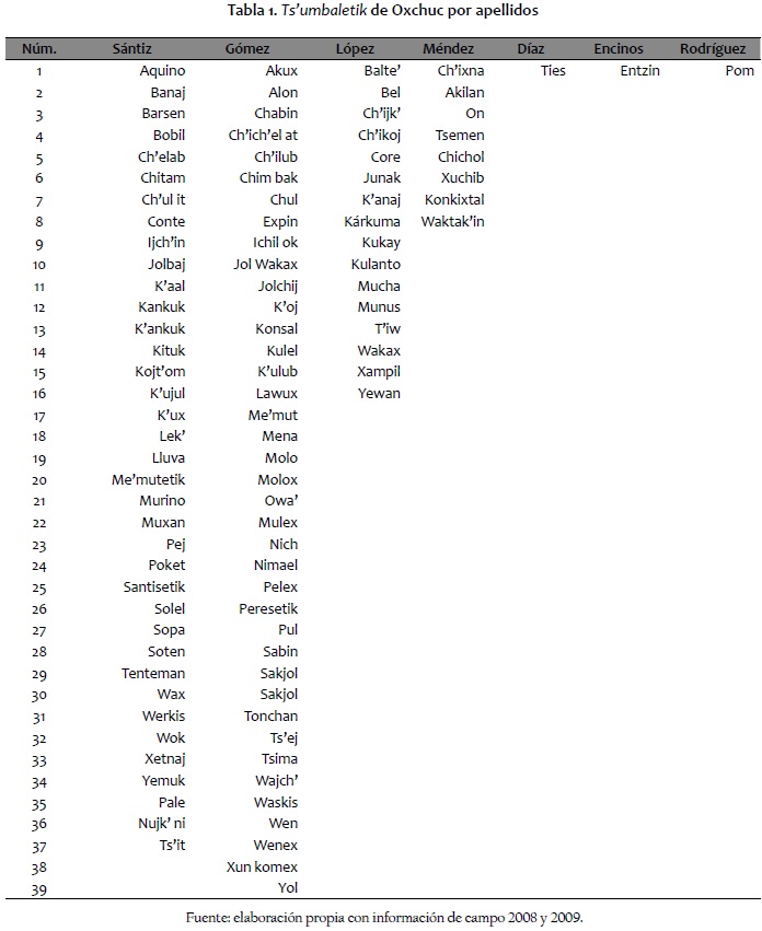 Los ts'umbaletik de Oxchuc se agrupan en cuatro apellidos: 39 pertenecen a los Gómez, 37 a los Sántiz, 16 a los López, 8 a los Méndez, 1 a los Díaz, 1 a los Encinos y 1 a los Rodríguez. En total suman 103 ts'umbaletik (ver tabla 1). Estos ts'umbaletik conforman los núcleos poblacionales de los parajes o comunidades rurales de Oxchuc. Por ejemplo, en el paraje El Tzay, el ts'umbal K'ulub (chapulín) es el más numeroso; mientras que en El Corralito son mayoría los ts'umbaletik Murino, Mucha y Banaj. Los parajes de reciente creación -de 25 a 50 años-están integrados por uno o dos ts'umbaletik, como en los casos de Santo Domingo y Yaalkots.