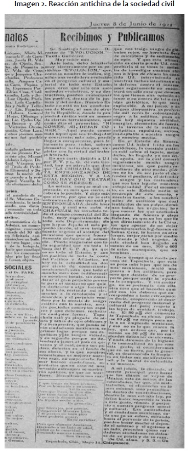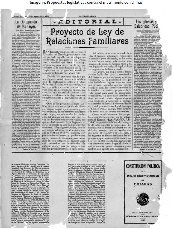 Es sabido que los vaivenes políticos de la posrevolución mexicana tuvieron en el nacionalismo un punto de encuentro de políticos e intelectuales, y dentro de esa eclosión simbólica y discursiva en busca de definir la nación mexicana destacaron las acciones xenófobas hacia colectivos de inmigrantes, en las que los chinos se convirtieron en objetivo de ataques de toda naturaleza, incluidas agresiones violentas o expulsiones del país. Es en esta última acción en la que aparecen los matrimonios entre asiáticos y mexicanas y todas las medidas tomadas para evitarlos e, incluso, el abandono del Estado mexicano hacia sus coterráneas que llegaron a China acompañando a sus maridos alejados forzosamente de México, por citar sólo dos de los aspectos relacionados con la unión entre mexicanas y chinos. En este texto se presentan dos documentos procedentes de la hemeroteca histórica resguardada por la Universidad de Ciencias y Artes de Chiapas. El primero, por orden cronológico, es una carta signada por "un chiapaneco" y dirigida al director del periódico Evolución, Santiago Serrano. En ella se condensan todas las preocupaciones y opiniones estereotipadas vertidas contra los inmigrantes chinos entre las que se incluye, por supuesto, el problema de los enlaces de mujeres mexicanas con asiáticos y los hijos resultantes de los mismos. El segundo documento corresponde al editorial del periódico La Vanguardia, que, como el anterior, se editaba en la capital de Chiapas, Tuxtla Gutiérrez. Publicado nueve años después del primero, en 1931, refiere la preocupación de las autoridades chiapanecas por restringir, a través de la legislación, los matrimonios entre mexicanas y chinos. No es una reproducción de las leyes y decretos del periodo posrevolucionario puesto que ello ocuparía demasiado espacio en esta sección de Documentos, pero invita a la búsqueda sistemática de dicha legislación para conocer la percepción y las acciones del ejecutivo de Chiapas respecto a los inmigrantes asiáticos y al papel de las mujeres en tal situación. Así, las páginas que componen este texto tienen la intención de poner en contexto los datos aparecidos en los documentos, al mismo tiempo que incitan, a quienes tengan interés en el pasado, a hurgar en las fuentes primarias en busca de un mayor conocimiento del tema en el estado.
