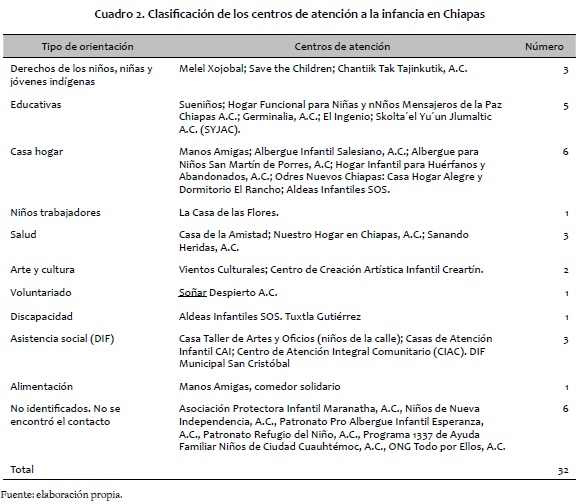En la primera etapa se realizó una búsqueda por internet2 en la que se logró identificar 32 centros de atención infantil en Chiapas y se pudo reconocer su organización y su eje de acción (ver cuadro 1).3