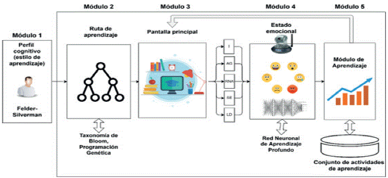 Sin embargo, plataformas de estudio convencionales no consideran el estado emocional del estudiante durante el proceso de aprendizaje. El estado emocional puede afectar/beneficiar la calidad del aprendizaje y el logro de los resultados deseados. Este estado es representado por el conjunto de emociones y sentimientos que determinan la relación de una persona con su entorno (Saarni et al., 2007). La importancia de identificarlo no recae en el hecho de reconocer qué emoción se genera al momento de aprender, más bien busca analizar el comportamiento del estudiante al interactuar en entornos virtuales de aprendizaje y, así, asignar contenidos acordes a intereses y preferencias individuales. Una de las mejores fuentes para reconocer el estado emocional es el rostro humano mediante expresiones prototípicas como: felicidad, miedo, disgusto, enojo, tristeza, sorpresa y neutral (Ahmady et al., 2022; Albraikan et al., 2022; H. Liu et al., 2023). En la actualidad, uno de los temas de mayor interés en el ámbito educativo son los ambientes de aprendizaje e-Learning. Hoy en día se han encontrado considerables progresos en la inte- roperabilidad de estos ambientes, por ejemplo, la adopción de otros actores como las técnicas basadas en algoritmos de Machine Learning (ML), Inteligencia Artificial (IA) y Métodos Adap- tativos permiten la integración de un nuevo diseño pedagógico según el perfil del alumno. Las plataformas e-Learning que integran IA forman lo que hoy se denomina Aprendizaje Adaptativo Inteligente (AAI), ya que poseen la capacidad de adaptar dinámica y automáticamente las actividades de aprendizaje a los requerimientos y necesidades específicos de cada estudiante, por ello es una de las tendencias en el presente.
