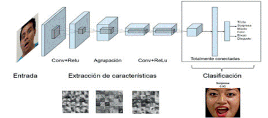 Estado emocional del estudiante: Para el reconocimiento del estado emocional, el ambiente de aprendizaje adaptativo emplea imágenes obtenidas de la webcam integrada en cada equipo personal y procesadas por una Red Neuronal de Aprendizaje Profundo llamada Alexnet (Krizhevsky et al., 2017; Cortes & Sanchez, 2021; Pérez et al., 2012), (ver Figura 2). El reconocimiento se lleva a cabo al finalizar cada actividad, así el sistema lleva un registro de forma individual.