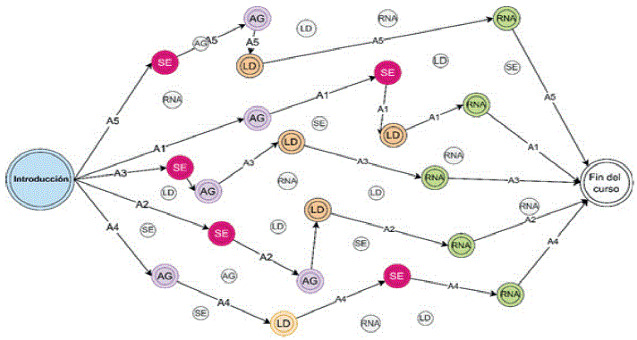 Ruta de aprendizaje: El grupo piloto que utilizó el ambiente e-Learning adaptativo se formó por una muestra seleccionada por conveniencia de cinco estudiantes pertenecientes al octavo semestre, de los cuales, cuatro de ellos se encuentran en la dimensión Visual y uno de ellos se encuentra en la dimensión Sensitivo. Los resultados de los estudiantes con perfil Visual serán representados con la nomenclatura A1 (Alumno1), A2 (Alumno 2), A4 (Alumno 4), A5 (Alumno 5), y un estudiante con perfil Sensitivo será representado con la notación A3 (Alumno 3). La Figura 4 muestra los caminos de forma individual de los estudiantes.