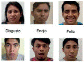 La base de datos contiene las expresiones emocionales: disgusto, enojo, feliz, miedo, sorpresa y tristeza (Ekman, 1993), (ver Figura 6).