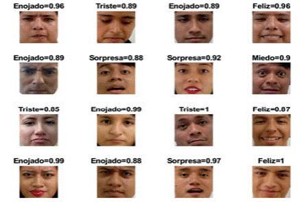 Para demostrar la exactitud en el reconocimiento del estado de ánimo, 16 estudiantes fueron clasificados de acuerdo a su expresión emocional, su probabilidad de pertenencia está en el intervalo [0 - 1], 0 = no pertenece, 1= pertenece, (ver Figura 7).