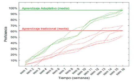Figura 9 Curvas de aprendizaje y valor medio entre aprendizaje adaptativo y aprendizaje tradicional