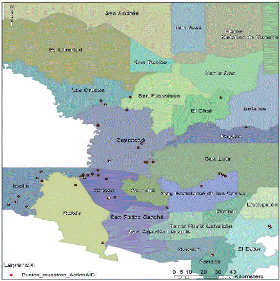 Los muestreos se llevaron a cabo en 45 puntos propuestos inicialmente a nivel de gabinete y posteriormente consensuados y validados en campo con las organizaciones miembros del consorcio ejecutor del proyecto (ActionAid, Congcoop y el Iarna) y la red local de monitoreo, evaluando la disponibilidad social y la accesibilidad física a los puntos para desarrollar el trabajo. El equipo investigador estableció previamente que estos puntos tuvieran representatividad con respecto a las microcuencas bajo estudio, con los diferentes usos principales de la tierra.7