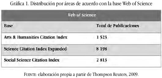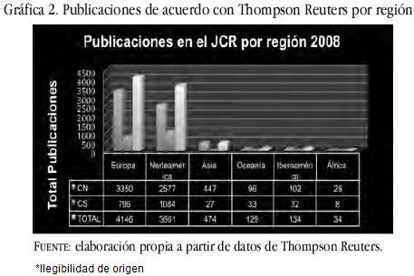 En la Gráfica 2 observamos que tanto para el caso de las publicaciones de ciencias naturales como de ciencias sociales entre América Latina y la Península ibérica son sólo relevantes después de la concentración existente en Europa, Norteamérica y Asia.