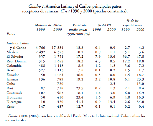 Hay que destacar que las remesas dirigidas a los países de la región representan cerca de 27 por ciento de los flujos a escala mundial, cifra que era menos de la mitad hacia 1980 y no alcanzaba 20 por ciento en 1990. Junto con los recursos recibidos por países de Europa oriental y Asia central, las remesas de la región han sido las de mayor crecimiento (Gammeltoft, 2002).