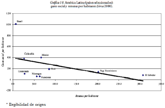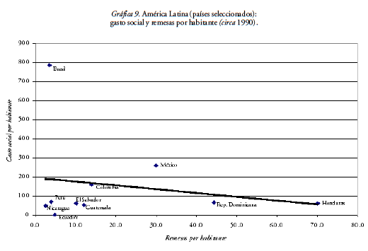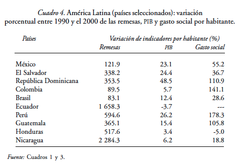 Se reconoce en ocasiones que el flujo de remesas entraña el riesgo de desestimular a los gobiernos locales en el cumplimiento de sus obligaciones, especialmente en cuanto a la atención de los sectores sociales. La inversión de los migrantes en obras comunitarias es un ejemplo de tal riesgo. Sin embargo, a nivel nacional, en la mayoría de los países de la región el gasto social por habitante creció durante los años noventa en función del crecimiento económico de la primera mitad y del aumento de la prioridad fiscal otorgada a dicho gasto. En promedio, la región pasó de 360 a 540 dólares por habitante (CEPAL, 2001).
