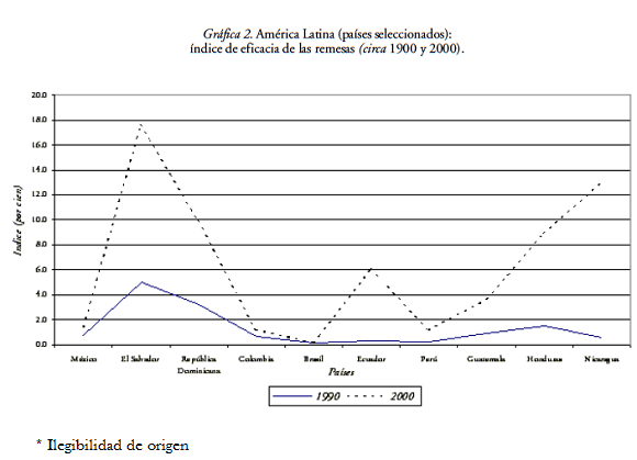 Hacia el 2000 las remesas superan los mil dólares por migrante en varios de los países estudiados, luego de que al comienzo de la década de 1990 este guarismo se registraba tan sólo entre los emigrantes de un país. Conjuntamente, creció en gran forma el dinero enviado por cada emigrado, lo que sugiere que no es únicamente el aumento de la migración lo que conlleva un mayor flujo de remesas. El promedio de estos recursos por habitante en los países que los reciben tiende a ser más elevado cuando menor es el tamaño demográfico y guarda cierta correlación negativa con el PIB per cápita. Como consecuencia, la eficacia de las remesas puede elevarse.
