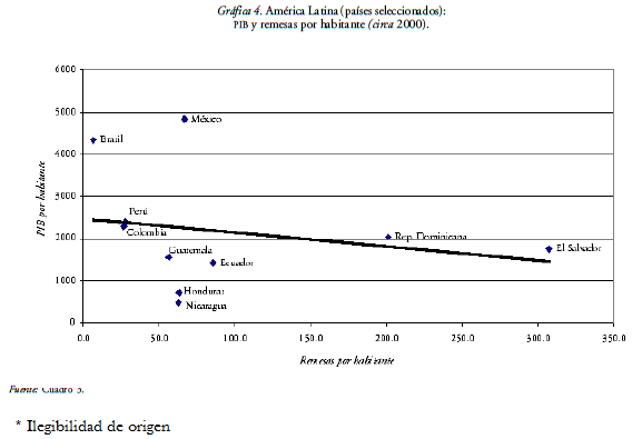 En síntesis, puede decirse que en el espectacular aumento de las remesas durante los años noventa se esconden impactos macroeconómicos variables, más notorios en algunos países con menores tamaños demográficos. Con la salvedad de tratarse de muy pocos casos, las gráficas 3 y 4 muestran cómo en el 2000 existía la tendencia hacia una relación negativa relativamente visible entre el PIB por habitante y las remesas por habitante, hecho que no se registraba diez años antes.
