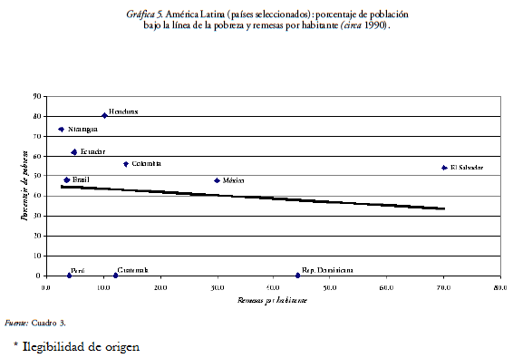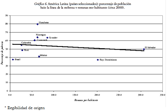 Ahora bien, en la escala macrosocial la pobreza afecta todavía a más de 40 por ciento de la población de la mayoría de los principales países receptores de las remesas, aunque disminuyó ligeramente en varios de ellos durante el decenio de 1990 (y en Ecuador registró un aumento). Sin embargo, las mayores incidencias de pobreza en el 2000 corresponden casi sistemáticamente a aquellos países donde la variación de las remesas por habitante fue más holgada: los centroamericanos y Ecuador (cuadro 3). Por último, entre los diez países considerados existe una ligera tendencia a que las remesas por habitante sean mayores justamente cuando más altos son los índices de pobreza (gráficas 5 y 6), si bien la mayoría de los países registra un monto de remesas por habitante inferior a 100 dólares.