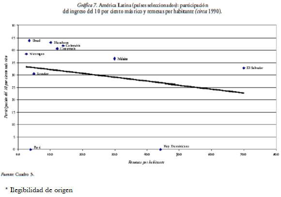 En síntesis, la inequitativa distribución del ingreso en la región no parece verse afectada todavía por las remesas, si es que éstas no contribuyen a mantenerla. Aun si tal contribución fuese efectiva en determinadas subregiones de los países, las evidencias disponibles sugieren que no basta con el horizonte temporal de una década para que sus efectos se expresen. Frente a esta obstinada persistencia de la inequidad distributiva en la región puede señalarse, cuando menos, que las características del patrón de desarrollo difícilmente se verán afectadas por la afluencia de las remesas, y ésta es una tarea que excede su fomento productivo.