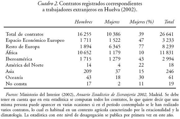 En cuanto a la nacionalidad de las mujeres residentes en la provincia de Huelva en 2002 y tomando los datos del Anuario Estadístico de Extranjería, la más representada es la iberoamericana (25%), seguida de las del resto de Europa (7%) y de África (3%). Se hace palpable el bajo porcentaje de mujeres procedentes del "resto de Europa", es decir, de la Europa no comunitaria, la mayoría de las cuales vienen con contratos en origen, y algunas permanecen de forma irregular en la provincia tras finalizar la temporada. Las mujeres latinoamericanas representan, sin embargo, un porcentaje más alto, al tratarse del grupo de mujeres cuya presencia en la provincia es más antigua, por lo que ha tenido más tiempo para su regularización.