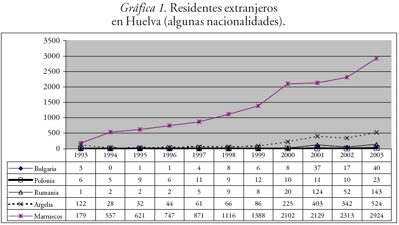 La población extranjera marroquí es la población extracomunitaria más numerosa en Huelva en la última década. Los oriundos de Marruecos y Argelia, junto con los portugueses, son los grupos de nacionalidad más numerosos entre los residentes. El peso que representaban los residentes extranjeros nacidos en países que han suscrito más recientemente un "Acuerdo de regulación de los flujos migratorios laborales" era anecdótico en los inicios de los años noventa (gráfica 1, respecto a Polonia, Rumania y Bulgaria). En 2003 se registran en la provincia 6 030 trabajadores extranjeros en alta laboral en la seguridad social, de los cuales 2 206 son de Marruecos, 363 de Argelia, 208 de Rumania y sólo 35 y 32 de Bulgaria y Polonia, respectivamente. En 1992 se registraron en Huelva tan sólo 609 permisos de trabajo a extranjeros. Aunque las cifras no aparecen desagregadas para esta provincia en el Anuario Estadístico de Extranjería, llama la atención que en toda España el total de permisos de personas procedentes de Bulgaria fuera de 10, 65 de Polonia y 22 de Rumania. En lo que concierne a los contratos registrados en Huelva a diciembre de 2002,9 se estima un total de 26 641 contratos, de los cuales 8 690 corresponden a marroquíes, 1 833 a argelinos, 1 668 a rumanos, 4 915 a polacos y 87 a búlgaros. Hay que subrayar que 91 por ciento de estos contratos son agrícolas y 90 por ciento por "obra y servicio", notándose claramente el efecto de la política de contrataciones en origen seguida en ese año. También llama la atención que en toda España el total de contratos a personas de Polonia era de 8 084. Ello quiere decir que 61 por ciento de los contratos extendidos en ese 2002 a ciudadanos de Polonia se produjeron en Huelva. Aunque no se publican datos desagregados por sexo y nacionalidad en el último Anuario Estadístico de Extranjería (1992), sí aparecen los contratos registrados a mujeres de países del "resto de Europa", un total de 6 345 (77%, respecto a los de varones de este grupo). En cambio, los contratos a mujeres africanas para ese año representaron sólo 10 por ciento (Ministerio del Interior, varios años).