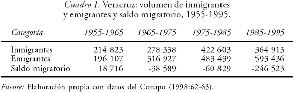 El cuadro 1 detalla el número de inmigrantes que llegaron a Veracruz y el de nativos que partieron de la entidad entre 1955 y 1995. De acuerdo con esta información, el saldo neto migratorio positivo mostrado en el período 1955-1965 revirtió su comportamiento en los años posteriores. En la década 1965-1975 el estado empezó a expulsar más población de la que recibía, mostrando signos negativos resultado de un incremento creciente de la emigración estatal y una disminución de la atracción migratoria en el período 1985-1995.