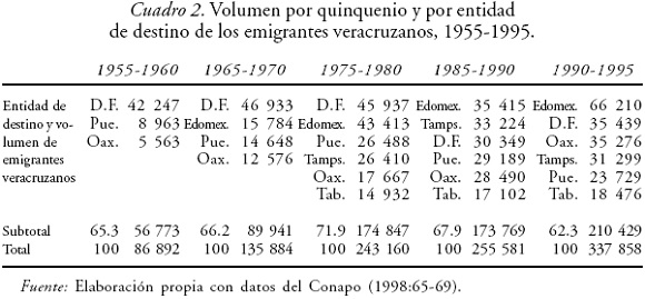 El cuadro 2 muestra el volumen y las principales entidades de destino en el país de los emigrantes veracruzanos entre 1955 y 1995, que en conjunto alcanzaban al rededor de dos terceras partes de su flujo interno.