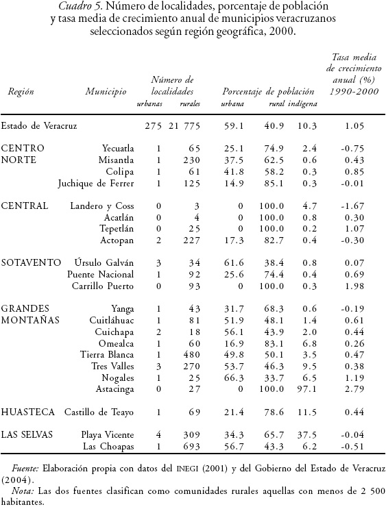 En principio, advertimos que si bien el estado de Veracruz tiene un gran número de localidades rurales con poblaciones menores a 2 500 habitantes, casi 60 por ciento de su población son residentes urbanos. La información del cuadro 5 permite establecer que los 22 municipios veracruzanos con grados muy alto, alto y medio de intensidad migratoria a Estados Unidos están conformados mayoritariamente por localidades rurales y que su población es escasamente indígena -con excepción de Astancinga, donde casi la totalidad de su población es indígena, y Playa Vicente, donde cerca de 40 por ciento también lo son. Solamente en los municipios úrsulo Galván, Cuitláhuac, Cuichapa, Tres Valles, Nogales y Las Choapas más de la mitad de sus habitantes son considerados población urbana. En la gran mayoría de estos 22 municipios las tasas de crecimiento promedio anual observadas en la década 1900-2000 son menores a la unidad, e incluso negativas en una tercera parte de ellos, lo que nos indica un decrecimiento poblacional significativo asociado a la emigración de sus habitantes.