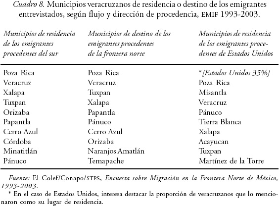 Con objeto de identificar los principales municipios de residencia de los emigrantes veracruzanos que arribaron a la region fronteriza mexicana procedentes del sur y de quienes retornaban a Veracruz desde la frontera norte o de Estados Unidos, en el cuadro 8 se registraron los diez municipios veracruzanos de residencia o destino en orden descendente de participación porcentual en el conjunto durante la década 1993-2003.