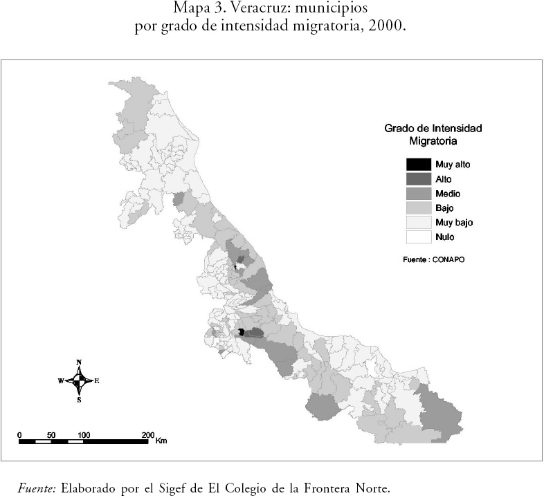 Atendiendo a las proporciones de hogares receptores de remesas y/o que tenían emigrantes en Estados Unidos en el quinquenio 1995-2000, el Conapo ubica a Veracruz como una entidad con bajo grado de intensidad migratoria internacional, aunque 10 por ciento de sus municipios mostraron grados medio, alto y muy alto de intensidad migratoria internacional. Territorialmente, podemos ubicar tres áreas geográficas donde se localizan esos municipios: la zona que conforman las regiones Centro-Norte y Central, la franja que se extiende entre el Sotavento y las Grandes Montañas y los municipios vecinos de las explotaciones petroleras al norte y al sur del estado.