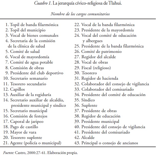 La jerarquía de Tlahui se conforma por 43 cargos (cuadro 1), reconocidos y respetados por los miembros de la comunidad. Los cargos se turnan entre los adultos del pueblo, en su mayoría hombres, en forma rotativa. Generalmente duran un año, aunque en algunos oficios pueden durar hasta tres años. Después del período de cargo, la persona regresa a sus actividades normales y no tiene que responsabilizarse de otro servicio por un tiempo relativamente largo. Asimismo, los cargos no tienen ninguna remuneración económica.