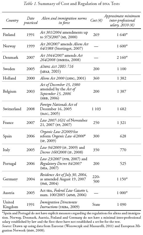 Since the mid-1990s, parallel to the restriction or closure of the ordinary means of entry for new immigrants, family reunification, together with work, has become one of the quantitatively most important sources of new immigration in Europe (Kofman, 2009:244-245) and more recently in Spain. Family reunification is a mechanism for immigrants already residing in national territory to be able to reunite with their relatives in order to exercise their right to family life and thereby contribute to their social and economic integration into the host society (Solanes, 2008a:147 and ff). The fact that it is a mechanism for legal entry, a fundamental right and means of integration justifies the legal will to configure this in its minimum expression and promote a somewhat negative perception through the use of tendentious labels such as drag, suffered or false immigration (De Lucas, 2006:45; Solanes, 2008a:144-145; Wihtol, 2006:261-266). Among the requirements linked to the duration of residence and residence permits, the availability of sufficient financial capacity and housing capacity and the procedural phases included in the family reunification regime, proof of kinship links, in the absence of quotas or work contingencies, are crucial to determining this right in most European Union states. Although this requirement might appear to be a simple test, since the basis of family reunification and the family is the existence of family links, this does not necessarily make it easy. Indeed, family links are usually accredited through the documents required by the authorities concerned who determine whether or not to grant appeals for family reunification. However, there are exceptions to this general rule, sometimes imposed by the legislators and at other times, justified in the event of doubt, which are solved by proving the authenticity of these documents. This article reviews the practice of DNA testing in family reunification in Europe, with particular emphasis on the Spanish case. On the one hand, it will provide a comparative chart of European countries that have included these practices with the aim of analyzing their extremes. And, on the other hand, it will question the admissibility of resorting to DNA testing in this procedure, which has often been used in paternity tests and criminal investigation in penal trials (O'Callaghan, 1994; López, 2004:221). This is basically because if the scientific use of DNA is generalized and extended, then the problems that occur in relation to advances in genetic and legal issues will also increase. Therefore, its extension to other spheres including migration, in keeping with the moral obligations of the states regarding family reunification and asylum (Carens, 2003:96; Solanes, 2010) require maximizing the protection of the rights at stake and optimizing all due guarantees in their practice, even in exceptional cases.