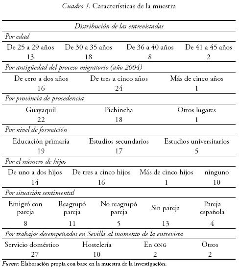 Los datos en los que se basa este artículo se obtuvieron mediante una combinación de técnicas desplegadas a lo largo de las investigaciones citadas, entre las que destacan la observación participante y las entrevistas en profundidad. En la primera investigación seleccionamos una muestra representativa con base en distintas variables: lugar de procedencia, antigüedad del proceso migratorio, edad, nivel de formación, número de hijos, situación sentimental en relación con el proyecto migratorio y trabajos desempeñados en Sevilla. Para la selección procedimos a contactar a una serie de informantes clave en relación con el grado de conocimiento de las redes de migrantes ecuatorianos. En su mayoría eran directivas/os de asociaciones de inmigrantes o trabajadoras/es y/o voluntarias de organizaciones no gubernamentales pro inmigrantes (pocos hombres migrantes latinoamericanos se apuntan para el voluntariado social, al menos en Sevilla). Para evitar el sesgo de la sobrerrepresentación de las personas con mayor capital social recurrimos a la técnica de bola de nieve. A cada una de estas informantes le pedimos que nos proporcionara el contacto con una mujer miembro de su red y con otra que estuviera fuera de ésta, y de la que apenas tuviera información. Aunque la idea era llegar a las 100 entrevistas, a partir de las 40 los contactos se repetían, por lo que tuvimos que dar por terminada esta fase. Teniendo en cuenta que el número de inmigrantes de nacionalidad ecuatoriana que en esos momentos vivían en Sevilla no llegaba a 2 600 personas, consideramos que el acceso a 20 redes diferentes es una proporción suficientemente representativa, sobre todo asumiendo que estas redes, en su conjunto, abarcaban a unos 500 compatriotas, aunque el grado de intensidad de la relación era muy variable. Para acotar los intercambios a través de la red se definieron una serie de ámbitos de relación: familiares, vecinales, laborales y de sociabilidad. Esta técnica se complementó con la revisión estadística de los datos disponibles sobre el flujo de inmigrantes y su integración social, tanto en España como en Sevilla, proceso que se ha ido actualizando cada año desde 2004 hasta la fecha y, sobre todo, con la observación participante en celebraciones familiares, actos festivos más o menos institucionalizados, eventos deportivos y actividades culturales, sin descartar el acompañamiento y apoyo en actividades diversas: matriculación de los hijos en las escuelas, obtención de certificados y otros trámites burocráticos. Esta última técnica, si bien se reveló como altamente eficaz para acceder a cuestiones que quedaron veladas en la entrevista formal, tuvo ciertos efectos sobre la propia observación, ya que en algunos casos llegamos a formar parte de la red, lo que nos dificultó la toma de distancia necesaria en la investigación, particularmente durante la segunda etapa (2005-2007) de ésta. En la última fase que establecimos (2008-2011), esta relación entre la observación y la participación se complicó por la fuerte carga afectiva que provocaron las duras situaciones de exclusión social que algunas de las informantes padecían.