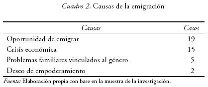 Uno de los aspectos más difíciles de analizar es el referente a las causas que motivaron la decisión de emigrar. Hemos de tener en cuenta que, la mayoría de las veces, las explicaciones que se ofrecen son legitimaciones a posteriori basadas en la experiencia propia, pero también en las justificaciones propuestas desde fuera como "causas objetivas". En la muestra se encuentran claramente dos grandes tendencias en las respuestas obtenidas. Un porcentaje significativo (37 %) de estas mujeres citaron como causa principal de su migración los factores relativos a la crisis político-económica que afectó al país a finales de los noventa. Sin duda, el emic (las representaciones sociales de las entrevistadas) coincide con el etic (las categorías analíticas elaboradas por los investigadores), que señala la preeminencia de los factores estructurales sobre los otros aspectos subyacentes tras la toma de la decisión de emigrar. Sin embargo, conviene destacar que fueron más aún las mujeres que citaron, como motivo principal de su decisión de migrar, que tuvieron la oportunidad de hacerlo (46 %). De este modo, se introduce en el análisis una variable cuya trascendencia resulta, a menudo, subestimada: la dinámica de las propias redes transnacionales como estructuras que fortalecen el flujo migratorio, por cuanto abaratan los costes de la estrategia migratoria (Ramírez y Ramírez, 2005). En la medida en que estas redes transnacionales facilitan la opción de emigrar y amortiguan sus costes -económicos y emocionales-, el flujo migratorio se mantiene en altos niveles, incluso cuando la situación económica en el país de origen pueda mejorar (Portes, 1997).