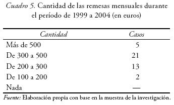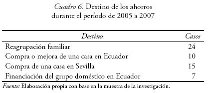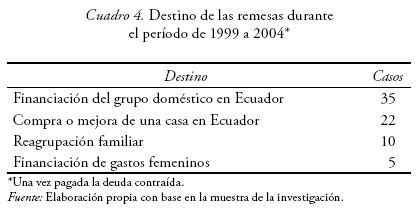 En un alto número de casos estudiados (83 %), el importe que se envía mensualmente constituye la principal fuente de financiación del grupo doméstico que lo recibe. Cuando esto sucede, la migrante se constituye como proveedora principal y responsable última del equilibrio económico que sustenta en Ecuador, algo que implica a veces un sometimiento a presiones familiares que a su vez pueden ser fuente de situaciones emocionalmente dolorosas para ella. Una vez resuelta la crisis provocada por el endeudamiento y anulado el riesgo de los impagos para los familiares que permanecen en Ecuador, la red en el entorno de origen se centra en la demanda de estas remesas, lo que obliga a la migrante a mantener un estilo de vida basado en una austeridad extrema en las sociedades de destino y, aunque conseguir remesas era la base del proyecto migratorio, a medida que la migrante va integrándose a la sociedad sevillana va siendo más consciente del importante sacrificio que estos envíos monetarios suponen para ella, lo que produce una crisis del proyecto migratorio original.