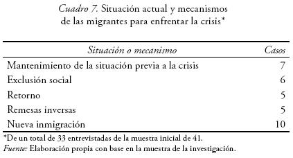 En el caso de las ecuatorianas, la actual situación de crisis económica que atraviesa el Estado español es percibida como un déjà vu que conecta la experiencia vivida en el país de origen con la que están viviendo en el de destino. La situación actual supone otra nueva vuelta de tuerca en las estrategias transnacionales, probando, hasta extremos imposibles, la flexibilidad y la versatilidad de las redes. En este momento, las estrategias desplegadas en la segunda etapa, basadas en la circulación de personas más que en la de recursos, dejan de ser funcionales no sólo por las cada vez mayores restricciones legales que el Estado español impone a la inmigración en general y la reagrupación familiar en particular, sino porque España ha perdido su atractivo como país de destino. Sin embargo, la actual situación no ha afectado por igual a todas las mujeres que conforman la muestra. Dependiendo de cuáles fueran las estrategias de las migrantes y de sus redes, las consecuencias varían desde quienes se encuentran de nuevo en la situación de partida -incluso asumiendo un índice de endeudamiento mayor (70 % de las 23 mujeres de la muestra que hemos podido contactar)- hasta quienes han logrado cumplir gran parte de los objetivos que guiaban su proyecto migratorio, contemplando la actual crisis económica en España como un nuevo aliciente para el retorno, pese a que la desconfianza frente al futuro en Ecuador y, por consiguiente, la representación social de éste como un país en crisis sigue estando presente.