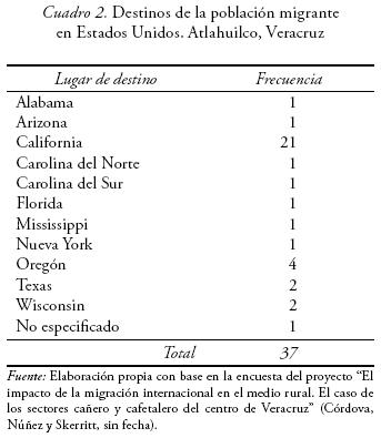 Un examen de los destinos principales de la población de Atlahuilco en Estados Unidos indica que California sigue siendo el preferido por una abrumadora mayoría de migrantes, la cual se concentra en las ciudades de Los Ángeles, Orange y San Diego. En segundo término, muy por debajo, el estado de Oregón. El resto se reparte entre destinos tradicionales, como Texas e Illinois, y emergentes, como Alabama y las Carolinas. En el cuadro 2 se presenta la frecuencia de los migrantes de la muestra en los diferentes lugares de llegada.