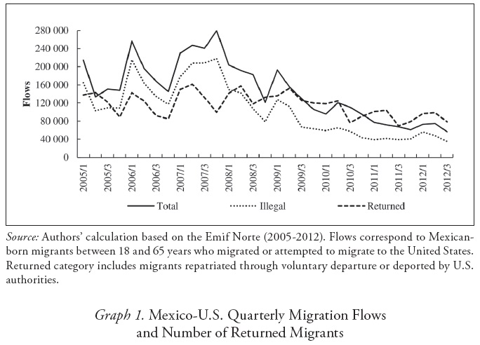 Despite increased border enforcement efforts, it is estimated that from 2005 to 2012, an average of approximately 570 000 Mexican-born migrants attempted to enter the U.S. each year. Graph 1 shows that among these individuals, 71.81 percent did not have the required documentation to lawfully enter the country. Nonetheless, there has been a significant drop in the number of migrants attempting to cross the U.S.-Mexico border in recent years, particularly from 2008 onwards.4 While the reduction in undocumented migration flows may suggest that the border enforcement strategy has successfully deterred clandestine immigration, previous research on the success of this policy suggests that its effect has been limited (Espenshade, 1994; Sorensen and Carrión-Flores, 2007), given that these flows are mainly driven by earnings differentials. Furthermore, it has been stated that the downturn of the U.S. economy and the high unemployment rates in sectors that traditionally employ a large proportion of legal and illegal migrants seem to be the main factors behind the reduction in the Mexico-U.S. migration flow (Alonso, 2012:229).