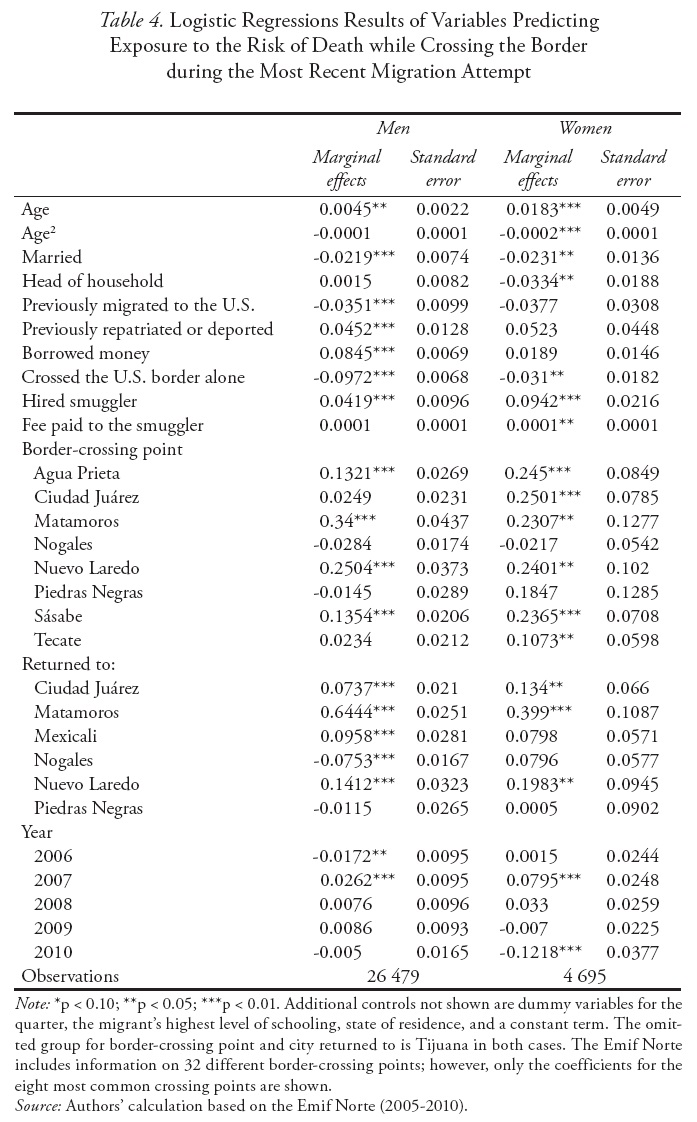 Furthermore, male migrants that have previously been repatriated or deported are 4.52 percentage points more likely to be exposed to risk compared to migrants undertaking their first trip to the United States. This result may indicate that previously detained migrants are more willing to travel through particularly inauspicious areas or use riskier methods in order to avoid being captured by USBP agents since repeat-offenders tend to face harsher sanctions, particularly since the implementation of Operation Streamline (Lydgate, 2010). Furthermore, it is observed that males who report borrowing money in order to travel to the U.S. have a higher likelihood of having been exposed to risk compared to male respondents that did not borrow money. This result suggests that financial constraints play an important role in the risks faced by migrants. Regarding the risks posed by relying on human smugglers, males and females who hired their services are 4.19 and 9.42 percentage points, respectively, more likely to have been exposed to the risk of death than those who did not hire a coyote. Finally, with respect to Tijuana, the most dangerous crossings zones were Matamoros and Nuevo Laredo for men, and Ciudad Juárez and Agua Prieta for women.