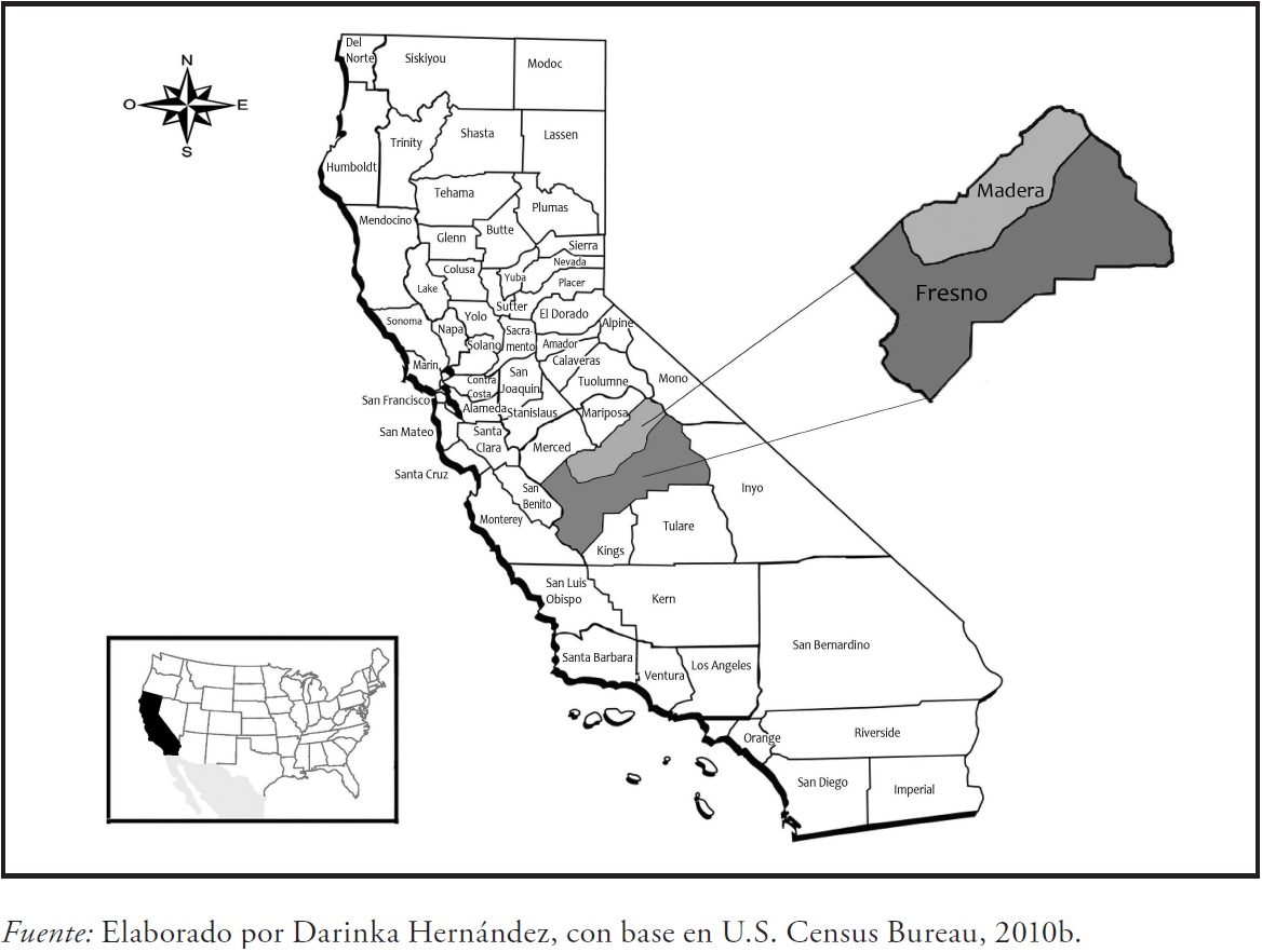 El condado de Madera cuenta con una población total de 150 865 habitantes, de los cuales 55.7 por ciento son de origen hispano o latino, con una alta concentración de inmigrantes indígenas mexicanos, provenientes principalmente de Oaxaca (U.S. Census Bureau, 2010a). Por otra parte, el condado de Fresno tiene un total de 930 450 habitantes, teniendo que 51.6 por ciento son de origen hispano o latino (U.S. Census Bureau, 2010a). En Fresno se encuentra la Universidad Estatal, en donde asisten algunos jóvenes que son parte de este estudio.
