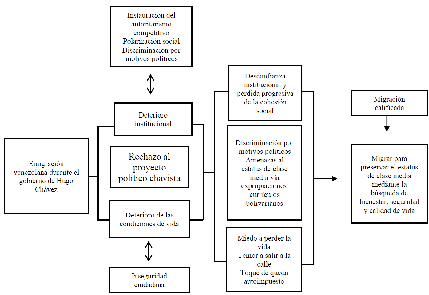 | Factores que inciden en la decisión de emigrar | Inseguridad, expropiaciones, rechazo al proyecto político chavista | Deterioro tanto institucional como de las condiciones materiales de existencia |